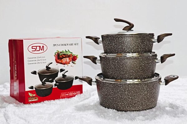 طقم من 3 طناجر GRANITE من علامة STM نوعية رفيعة ثلاثة أحجام مختلفة لمختلف إستعمالات المطبخ -22 سم-24سم-28سم مميزات المنتج: مصنوعة من مادة القرانيت غير قابلة للصدأ مضادة للإلتصاق سمكها 4 ملم يعطيك نوعية طبخ مميزة متوفرة في لونين اسود و بني