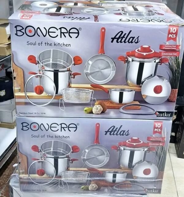🥘 طقم طبخ BONERA COCOTTE CLIPSO 11 قطعة ! ✨ تصميم أنيق، جودة عالية من الإينوكس 18/10، ضروري لكل مطبخ. قدرين ضغط + كسكاس+ مقلاة مصنوع من الاينوكس بجودة رائعة و تصميم أنيق BONERA COCOTTE CLIPSO 11 pcs 8L + 4L 💡 استخدامات متعددة 5 في 1 : 1️⃣ طنجرة ضغط 8 لتر للطهي العائلي. 2️⃣ طنجرة ضغط 4 لتر للحصص الفردية. 3️⃣ قدر كسكاس 8 لتر أو 4 لتر. 4️⃣ مرميطة مع غطاء (زجاجي/إينوكس). 5️⃣ مقلاة قوية وعملية. 🌟 المميزات : ✅ مصنوع من الإينوكس 18/10 بجودة عالية. ✅ نظام أمان متطور (مخرج ضغط مزدوج). ✅ طهي سريع وموفر للطاقة. ✅ مقابض متينة وغير قابلة للانزلاق. ✅ متوفر بلونين 🔴 أحمر 🟡 و ذهبي 🚚 التوصيل متوفر إلى 58 ولاية مع الدفع عند الاستلام. 📞 اطلب الآن على الرقم0559523435